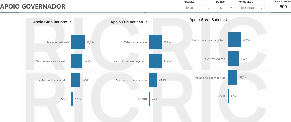 A Futura Inteligência realizou 800 entrevistas telefônicas entre 24 e 27 de janeiro no Paraná. A sondagem tem margem de erro de 3,5 pontos e índice de confiança de 95%. O levantamento foi registrado junto ao TSE sob o número PR-08318/2026,